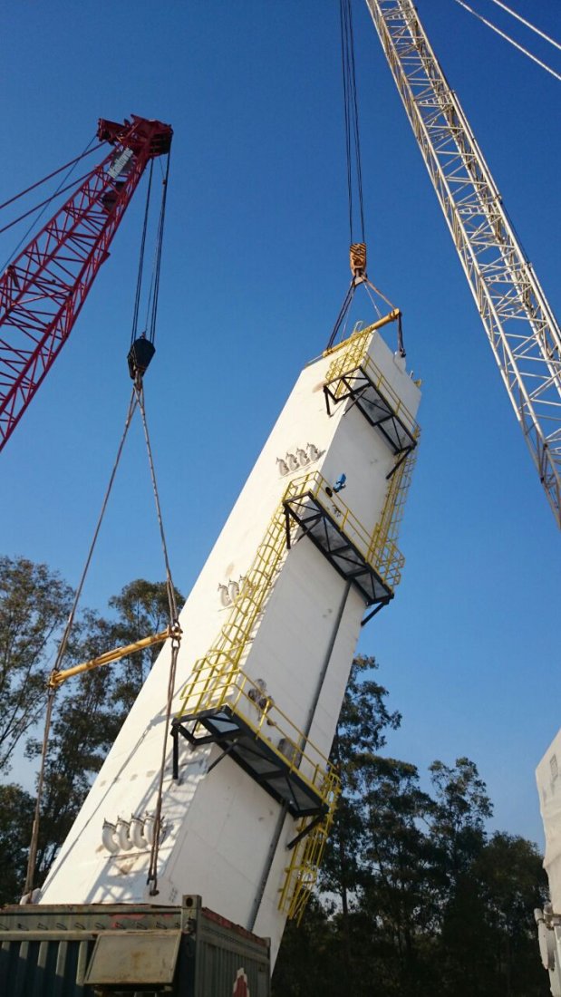 Transporte rodoviário, descarga, içamento de vasos e tanques. Verticalização e posicionamento de cold boxes na base para instalação.