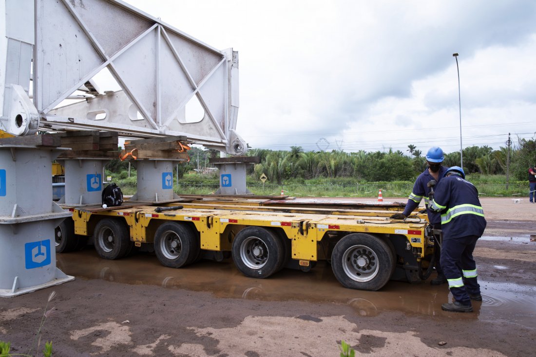 Depois, o transbordo do gerador da viga de transporte para um conjunto de 22 eixos autopropelidos (SPMT) em quarta fila, para garantir que o gerador não sofresse choques ou acelerações bruscas nas manobras internas do complexo.