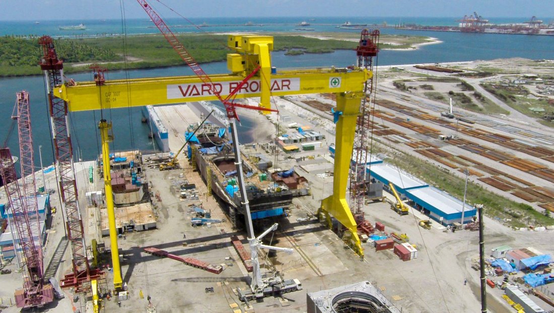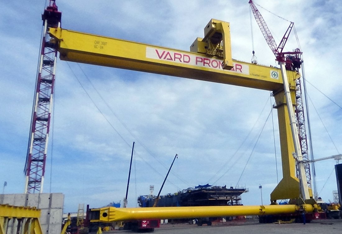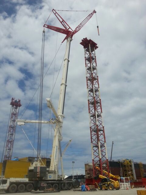Montagem de Goliath Crane em estaleiro, com utilização de torres de içamento (tower lift).