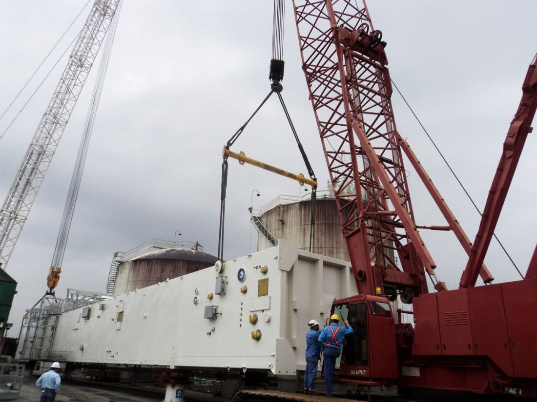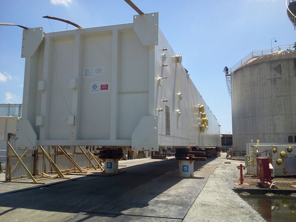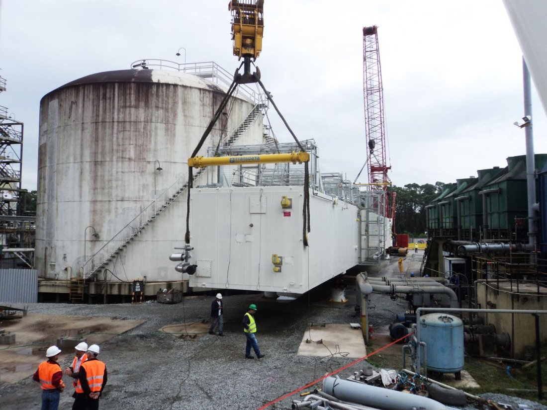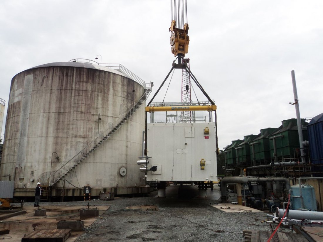O içamento e colocação na base para a instalação dos equipamentos era considerada uma das etapas críticas do projeto na visão do cliente e do fornecedor que produziu o equipamento projetado especialmente para a fábrica de gases.