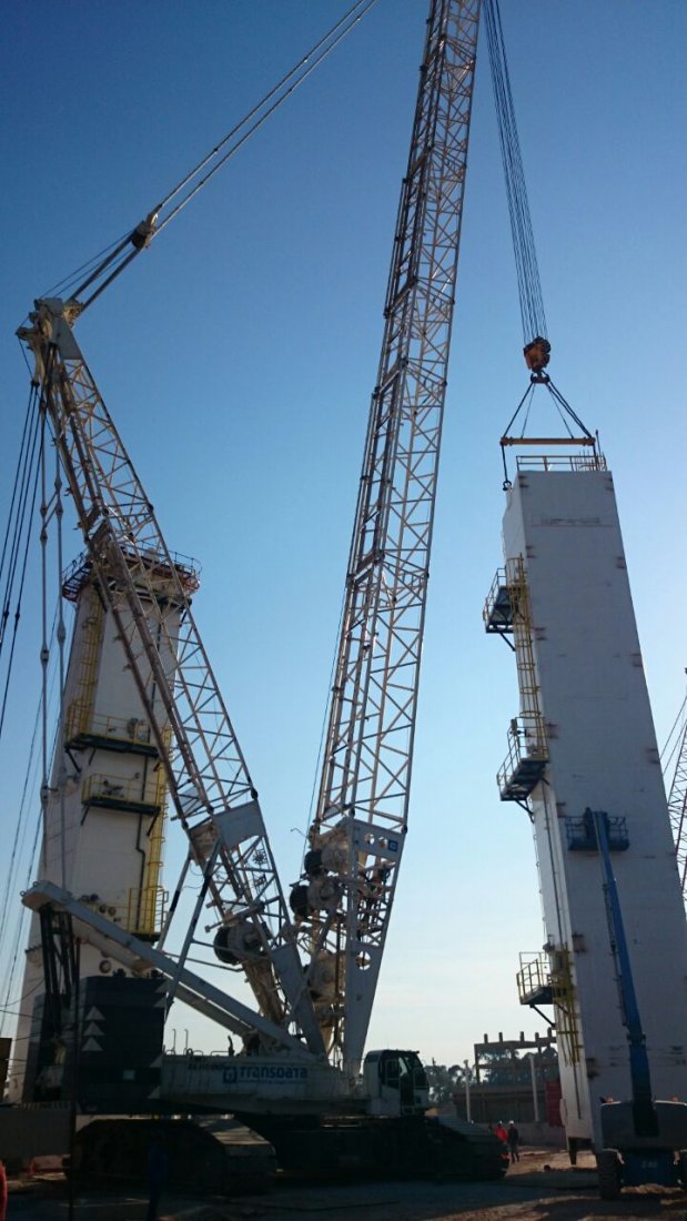 Transporte rodoviário, descarga, içamento de vasos e tanques. Verticalização e posicionamento de cold boxes na base para instalação.