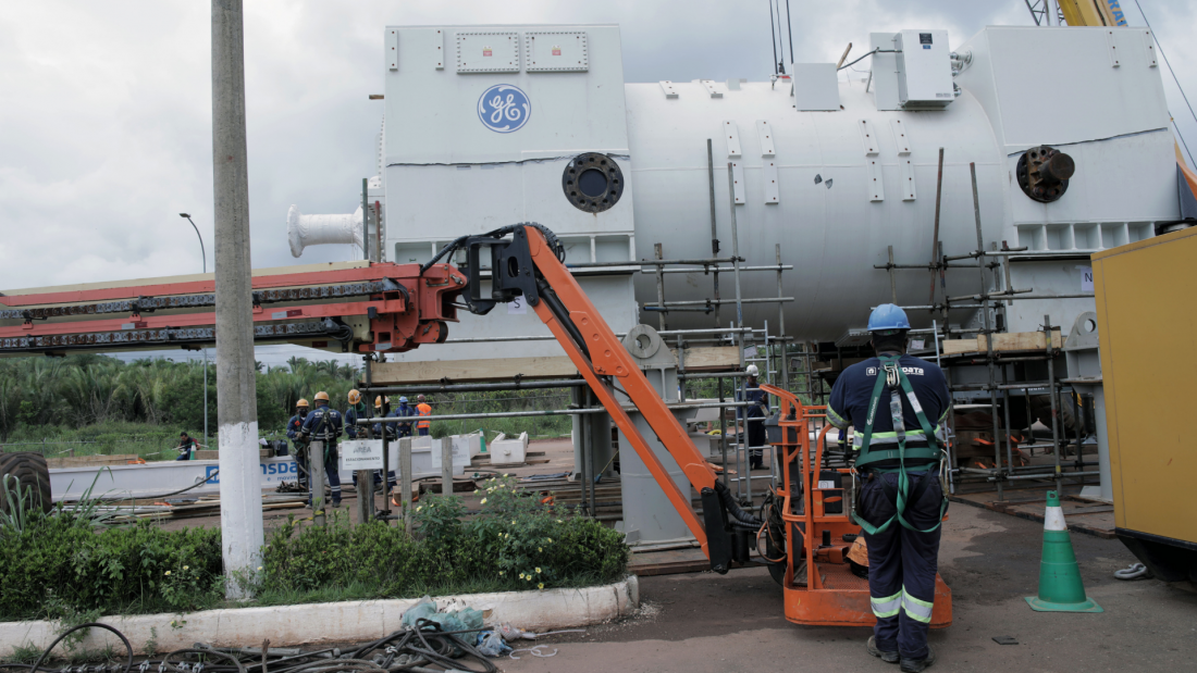 Quando da chegada do gerador no local de instalação, após os testes funcionais, foi realizado o alinhamento e posicionamento do gerador. Durante a elevação, a operação foi assistida por sistemas computadorizados e monitorados pela equipe de engenharia.