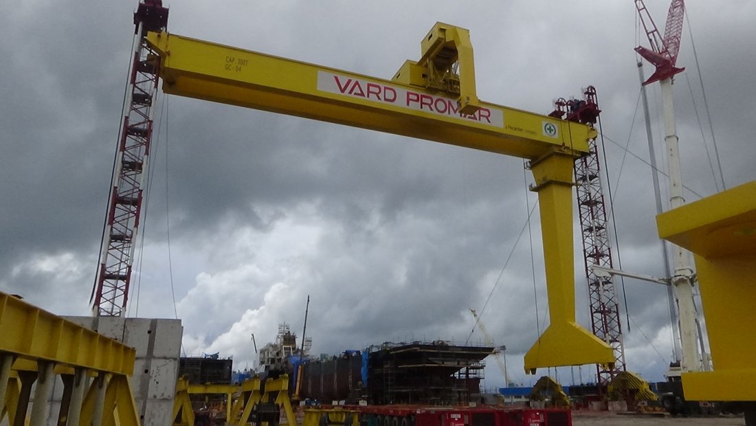 Montagem de Goliath Crane em estaleiro, com utilização de torres de içamento (tower lift).